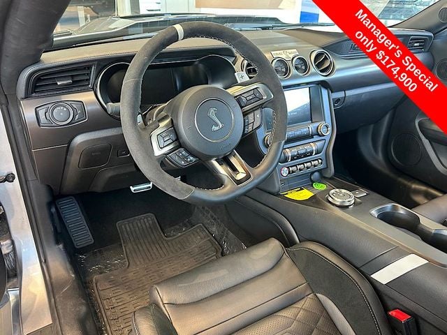Mustang Shelby GT500 SHELBY GT500 KR KING OF THE ROAD, 2D Coupe, 5.2L V8, 7-Speed Automatic, RWD, Iconic Silver Metallic, Gray Leather, BLIS Blind Spot Information System, Heated Mirrors, Navigation System, Radio: B&O Sound System by Bang & Olufsen, Technology Package, Voice-Activated Touch-Screen Navigation System, 20 Wheels, 4-Wheel Disc Brakes, 9 Speakers, ABS brakes, Adaptive suspension, Air Conditioning, Alloy wheels, AM/FM radio: SiriusXM, AM/FM Stereo, Auto-dimming Rear-View mirror, Automatic temperature control, Blue Indoor Car Cover (Dealer Installed), Brake assist, Bumpers: body-color, CD player, Compass, Delay-off headlights, Driver door bin, Driver vanity mirror, Dual front impact airbags, Dual front side impact airbags, Electronic Stability Control, Emergency communication system: 911 Assist, Exterior Parking Camera Rear, Four wheel independent suspension, Front anti-roll bar, Front Bucket Seats, Front Center Armrest, Front dual zone A/C, Front reading lights, Fully automatic headlights, Garage door transmitter, Heated front seats, High-Intensity Discharge Headlights, Illuminated entry, Knee airbag, Leather-Trimmed Sport Seats, Low tire pressure warning, Occupant sensing airbag, Outside temperature display, Overhead airbag, Panic alarm, Passenger door bin, Passenger vanity mirror, Power door mirrors, Power driver seat, Power passenger seat, Power steering, Power windows, Radio data system, Rear anti-roll bar, Rear window defroster, RECARO Leather-Trimmed Seats w/Miko Suede, Remote keyless entry, Security system, SiriusXM Radio, Speed control, Speed-sensing steering, Speed-Sensitive Wipers, Split folding rear seat, Spoiler, Sport steering wheel, Steering wheel mounted audio controls, SYNC 3 Communications & Entertainment System, Tachometer, Telescoping steering wheel, Tilt steering wheel, Traction control, Trip computer, Variably intermittent wipers, Ventilated front seats, Vinyl Over-the-Top Racing Stripe, Voltmeter, Wheels: 20 Flow Formed High Gloss Black Aluminum, GT500KR, KING OF THE ROAD, Mustang Shelby GT500 SHELBY GT500 KR KING OF THE ROAD, 2D Coupe, 5.2L V8, 7-Speed Automatic, RWD, Iconic Silver Metallic, Gray Leather, BLIS Blind Spot Information System, Heated Mirrors, Navigation System, Radio: B&O Sound System by Bang & Olufsen, Technology Package, Voice-Activated Touch-Screen Navigation System.