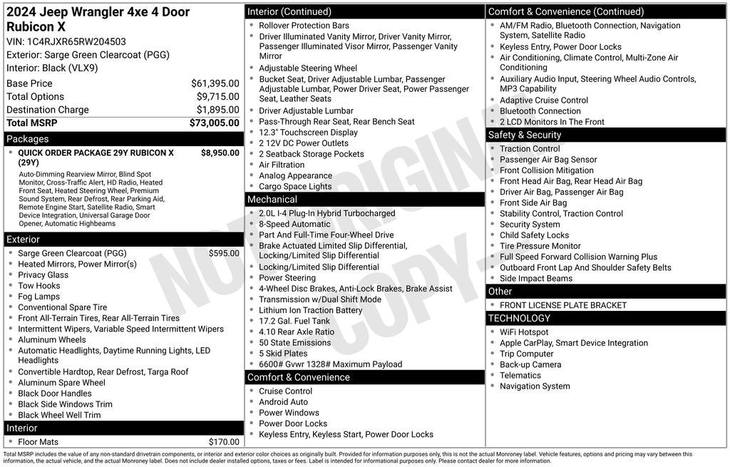 Equipped with Quick Order Package 29Y Rubicon X (12.3 Touchscreen Display, 4G LTE Wi-Fi Hot Spot, Acoustic Front Seat Area Carpet, Acoustic Laminated Front Door Glass, Alpine Premium Audio System, Apple CarPlay, Auto High Beam Headlamp Control, Auto-Dimming Rear-View Mirror, Blind Spot & Cross Path Detection, Body Color 3-Piece Hard Top, Connected Travel & Traffic Services, Connectivity - US/Canada, Disassociated Touchscreen Display, Freedom Panel Storage Bag, Google Android Auto, GPS Navigation, HD Radio, Heated Front Seats, Heated Steering Wheel, Integrated Center Stack Radio, Integrated Off-Road Camera, Integrated Voice Command w/Bluetooth®, Leather Wrapped Park Brake Handle, Leather Wrapped Shift Knob, MOPAR Hardtop Headliner, Nappa Leather Seats, No Soft Top, ParkSense Rear Park Assist System, Power 4-Way Driver Lumbar Adjust, Power 4-Way Passenger Lumbar Adjust, Power Adjust 8-Way Driver Seat, Power Adjust 8-Way Front Passenger Seat, Premium Door Trim Panel, Radio: Uconnect 5 Nav w/12.3 Display, Rear Window Defroster, Rear Window Wiper/Washer, Remote Start System, SiriusXM Radio Service, SiriusXM w/360L, Steel Front Bumper, Steel Rear Bumper, and Universal Garage Door Opener), Trailer Tow Prep Package (7 & 4 Pin Wiring Harness and 700 Amp Maintenance Free Battery), 2.0L I4 DOHC, 4-Wheel Disc Brakes, 4.10 Rear Axle Ratio, 8 Speakers, ABS brakes, Air Conditioning, Alloy wheels, AM/FM radio: SiriusXM, Apple CarPlay/Android Auto, Automatic temperature control, Body Color Rubicon Highline Flare (DISC), Brake assist, Compass, Delay-off headlights, Driver door bin, Driver vanity mirror, Dual front impact airbags, Dual front side impact airbags, Electronic Stability Control, Emergency communication system: Jeep Connect, Front anti-roll bar, Front Bucket Seats, Front Center Armrest w/Storage, Front dual zone A/C, Front fog lights, Front License Plate Bracket, Front reading lights, Fully automatic headlights, Heated door mirrors, Illuminated entry, Integrated roll-over protection, Low tire pressure warning, MOPAR All-Weather Floor Mats, Occupant sensing airbag, Outside temperature display, Overhead airbag, Panic alarm, ParkView Rear Back-Up Camera, Passenger door bin, Passenger vanity mirror, Performance Suspension, Power door mirrors, Power steering, Power windows, Radio data system, Radio: Uconnect 5 w/12.3 Display, Rear anti-roll bar, Rear reading lights, Remote keyless entry, Security system, Speed control, Split folding rear seat, Steering wheel mounted audio controls, Sustainable Premium Cloth Seats, Tachometer, Telescoping steering wheel, Tilt steering wheel, Traction control, Trip computer, Variably intermittent wipers, Voltmeter, and Wheels: 17 x 7.5 Machined w/Black Pockets.